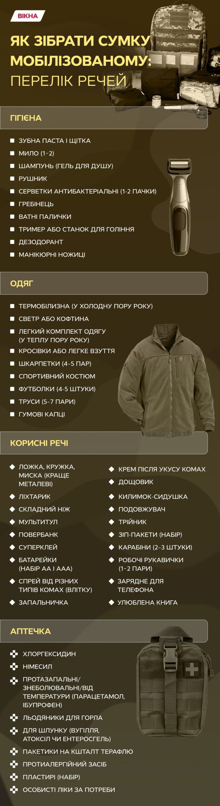 Як зібрати сумку мобілізованому: перевірений список речей та інфографіка Вікон