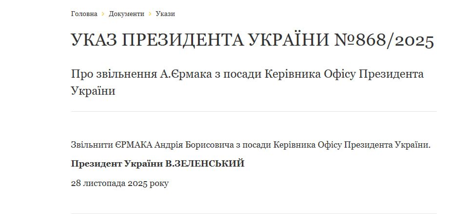 Як зазначалось у зверненні, завтра відбудуться консультації щодо нового голови Офісу Президента України. Також, на сайті Офісу президента України опубліковано указ про звільнення керівника ОП Андрія Єрмака.