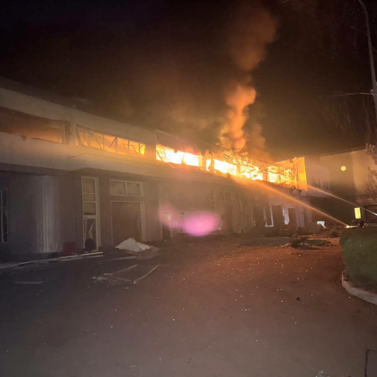 Працівники ДСНС загасили пожежу на площі 600 кв. м. Попередньо, в ангарі знищено дев’ять транспортних засобів та 27 пошкоджено.