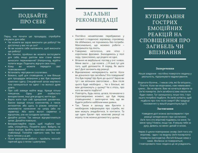 Рекомендації прості, але життєво необхідні: мати при собі воду, вологі серветки, одноразові рукавички, виходити на свіже повітря та робити перерви. Це нагадування про те, яку величезну емоційну ціну платять фахівці, щодня заглядаючи в очі людському горю.