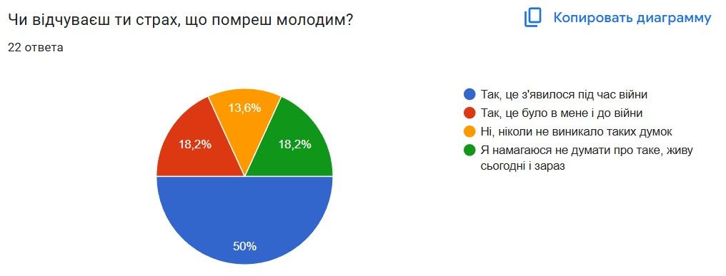Цікавою є і періодичність думок про смерть у молоді. За нашим опитуванням, 50% молодих людей згадують про те, що можуть померти в юні роки, періодично. Живуть постійно з цією думкою ще 13,6%. Під час російських атак думки про смерть навідуються до 27,3%.