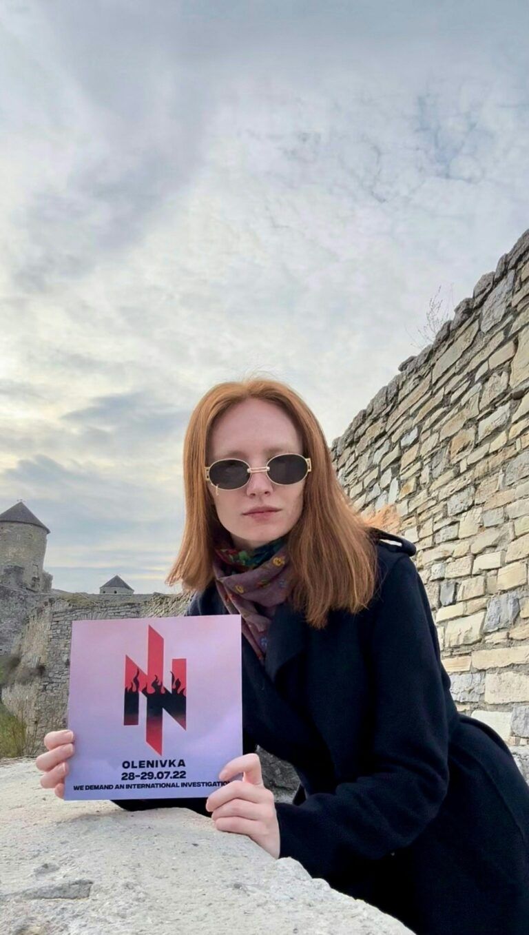 Тому, пояснює Олександра Мазур, організація й вирішила розпочати роботу над місяцем Оленівки за кордоном. Спершу були створені за допомогою Креативної Січі ілюстративні матеріали, потім — матеріали про поранених та загиблих героїв, які Спільнота Родин Оленівки зібрала з дозволами від родин на поширення.