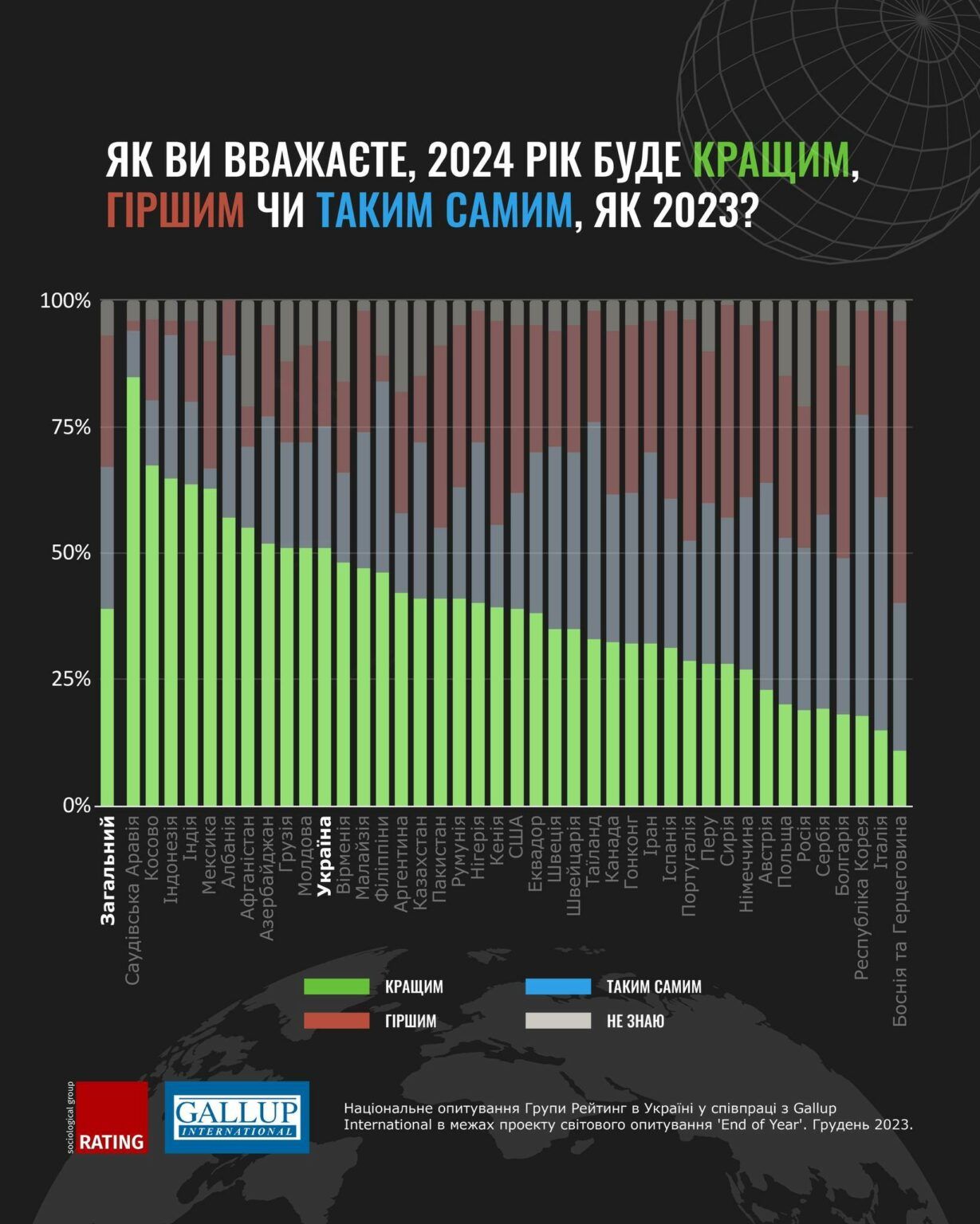 Соціологічна група Рейтинг спільно з інститутом досліджень Gallup International провела масштабне дослідження на тему очікувань від 2024 року. Опитування тривало протягом жовтня-грудня 2023 року.