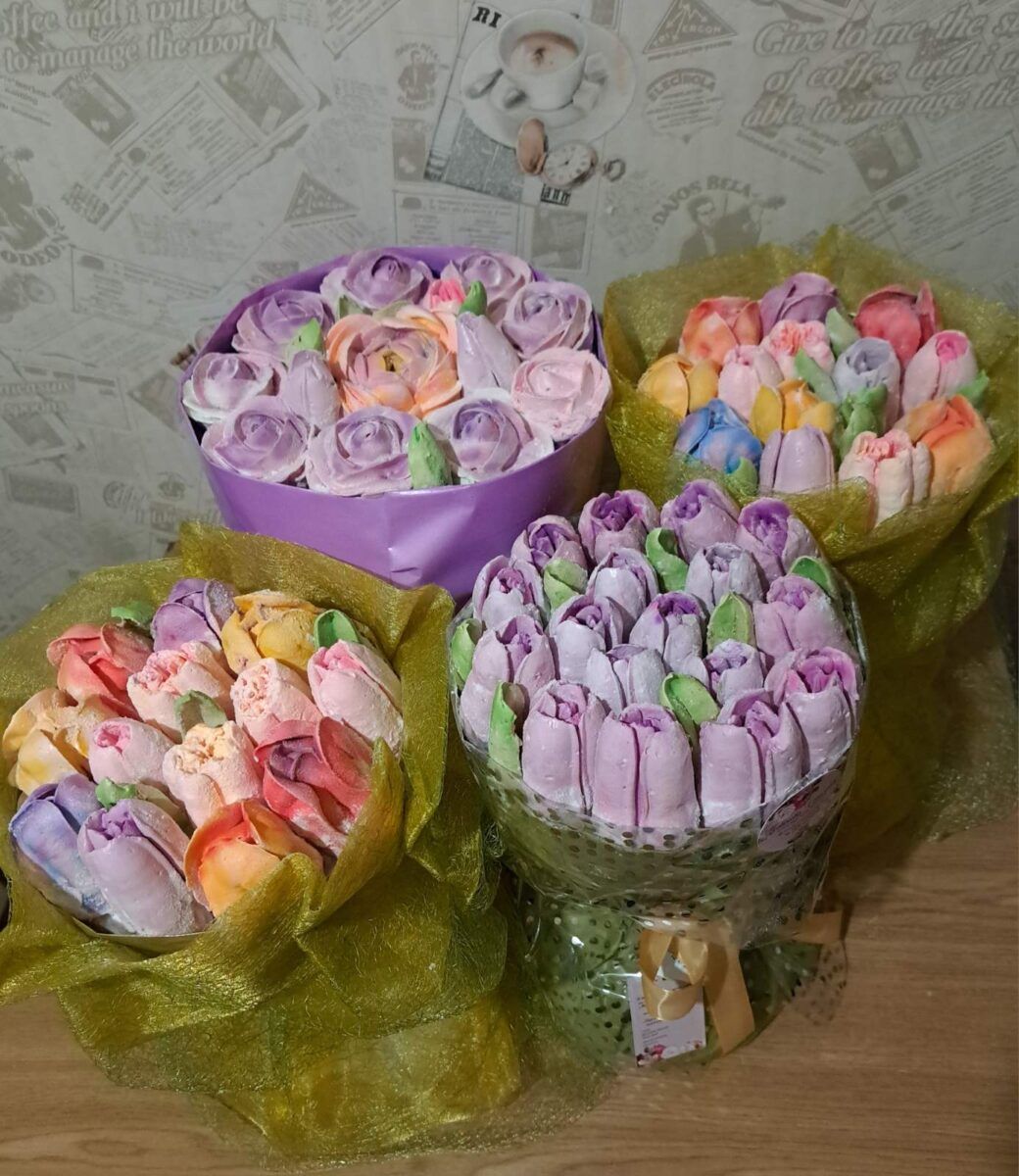 В асортименті Світлани Новікової зефір у вигляді бузку, кілька видів тюльпанів, троянди, іриси, нарциси, маки, еустома, гвоздики, анемони, ромашки, гортензії. А ще кактуси, жоржини та айстри. Для чоловіків, каже кондитерка, створила пакуночки із сала — це пташине молоко, часнику — це зефір і пельменів — це шоколадні цукерки.