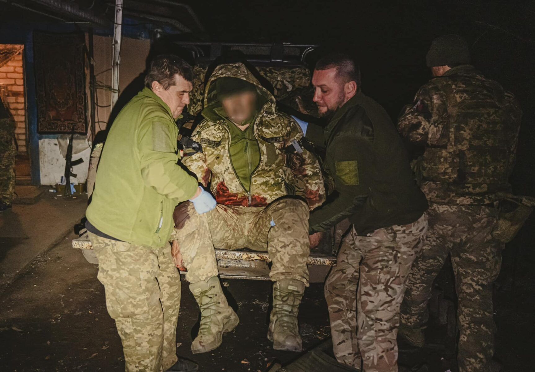 На обличчях викривлений відбиток болю, тому робота пришвидшується. Хто може йти самостійно, залишає на прохання медиків зброю й бронежилети на дворі, а самі проходять в одну з кімнат. Ними вже починають займатись фельдшери та санітари.