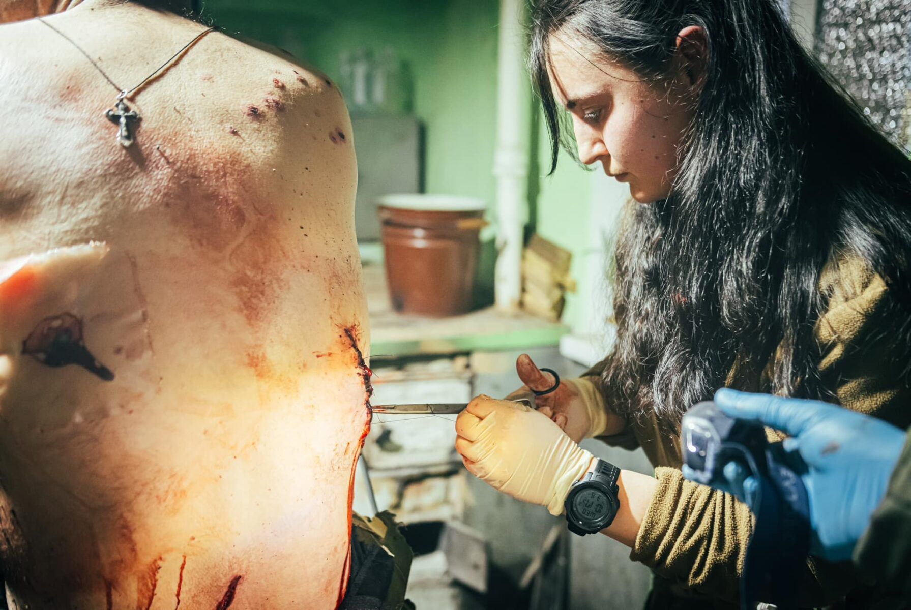 Іншим пораненим займається Ліля з Госпітальєрів. Бійцю умовно пощастило. Вона лише повернулась та вже почала займатись його спиною, яку розірвав великий уламок снаряда. Медикиня стіжок за стіжком зшиває дві окривавлені частини спини та заліплює поранення оклюзійною пов’язкою.