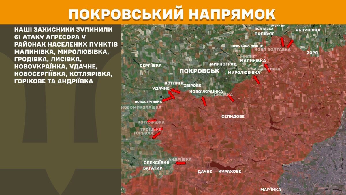 На Покровском направлении остановлена 61 атака агрессора в районах населенных пунктов Малиновка, Миролюбовка, Гродовка, Лисовка, Новоукраинка, Удачное, Новосергеевка, Котляровка, Орехово и Андреевка.