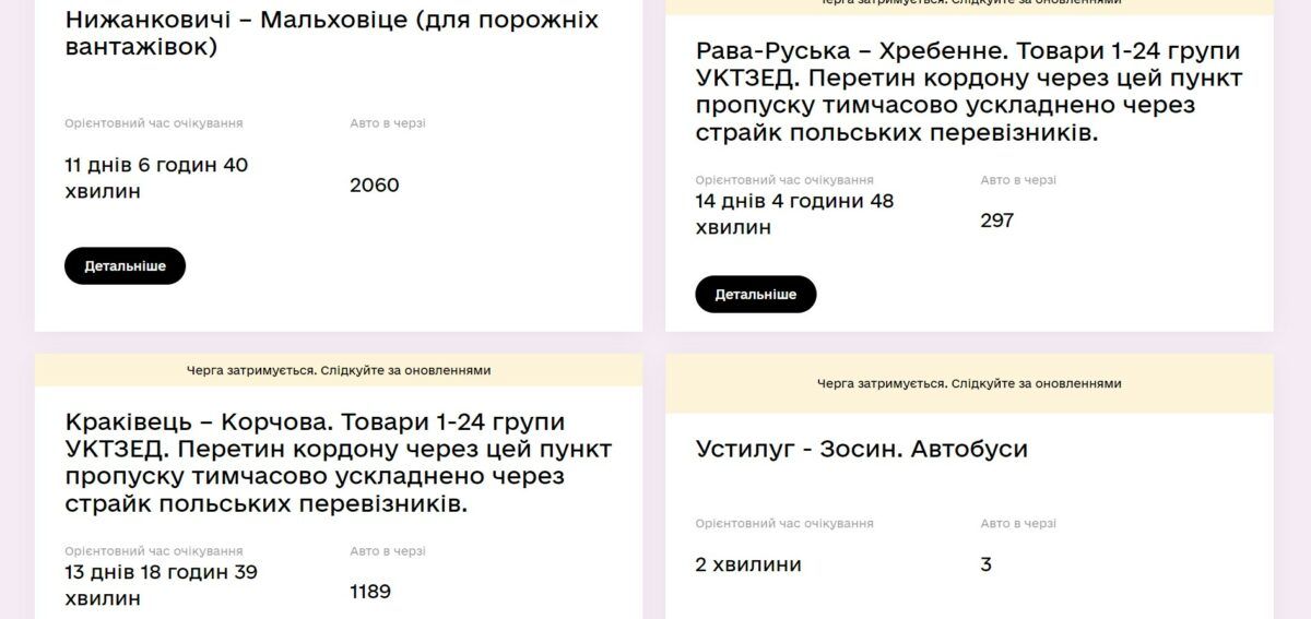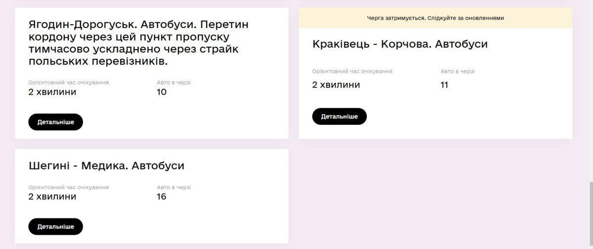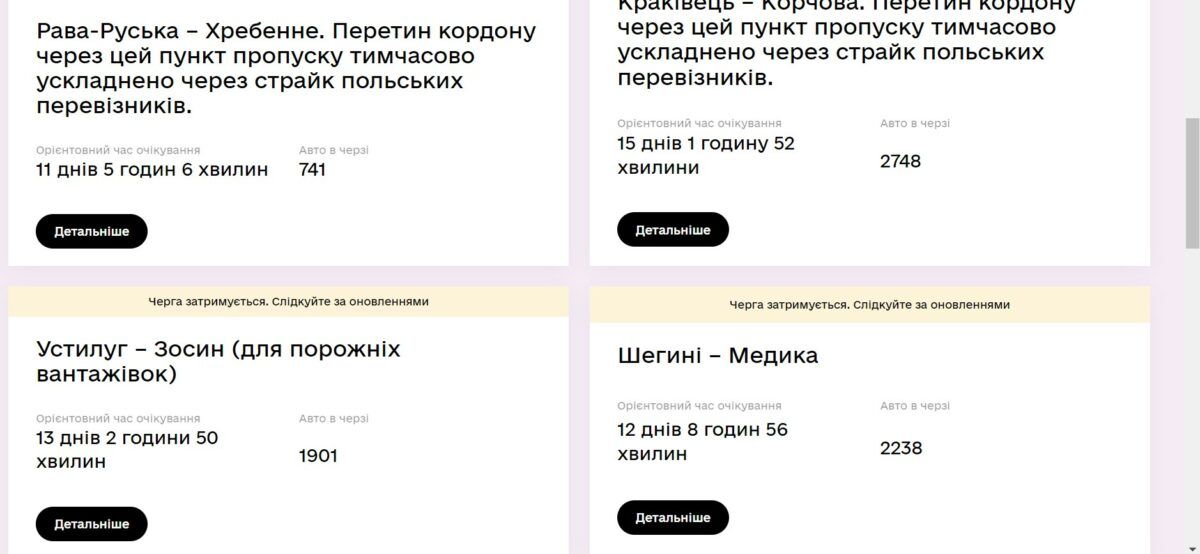 Представители Госпогранслужбы советуют следить за ситуацией через сервис єЧерга и выбирать наиболее удобный маршрут пока продолжается забастовка польских перевозчиков. Но, как отмечалось ранее, забастовщики пропускают легковые автомобили и автобусы.