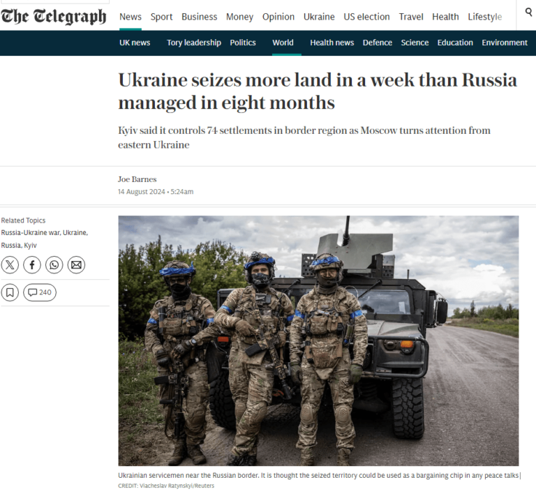 Світлину було зроблено для матеріалу з назвою “За тиждень Україна захопила більше землі, ніж Росія за вісім місяців”. Вона датується 14 серпня 2024 року.