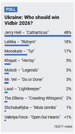 Несмотря на значительный отрыв лидера, борьба за второе и третье места остается напряженной. Второе место в рейтинге симпатий с показателем 18% занимает группа LELÉKA с треком Ridnym. Коллектив покорил аудиторию аутентичным исполнением, которое традиционно имеет высокую поддержку среди украинских зрителей. Тройку лидеров замыкает проект Monokate с песней TYT, чьи шансы оцениваются в 17%.