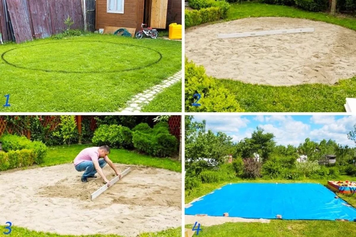 Самый простой вариант — утрамбованный грунт с песком или плотным газоном. Такой способ подойдет для временных бассейнов, но требует аккуратной подготовки.