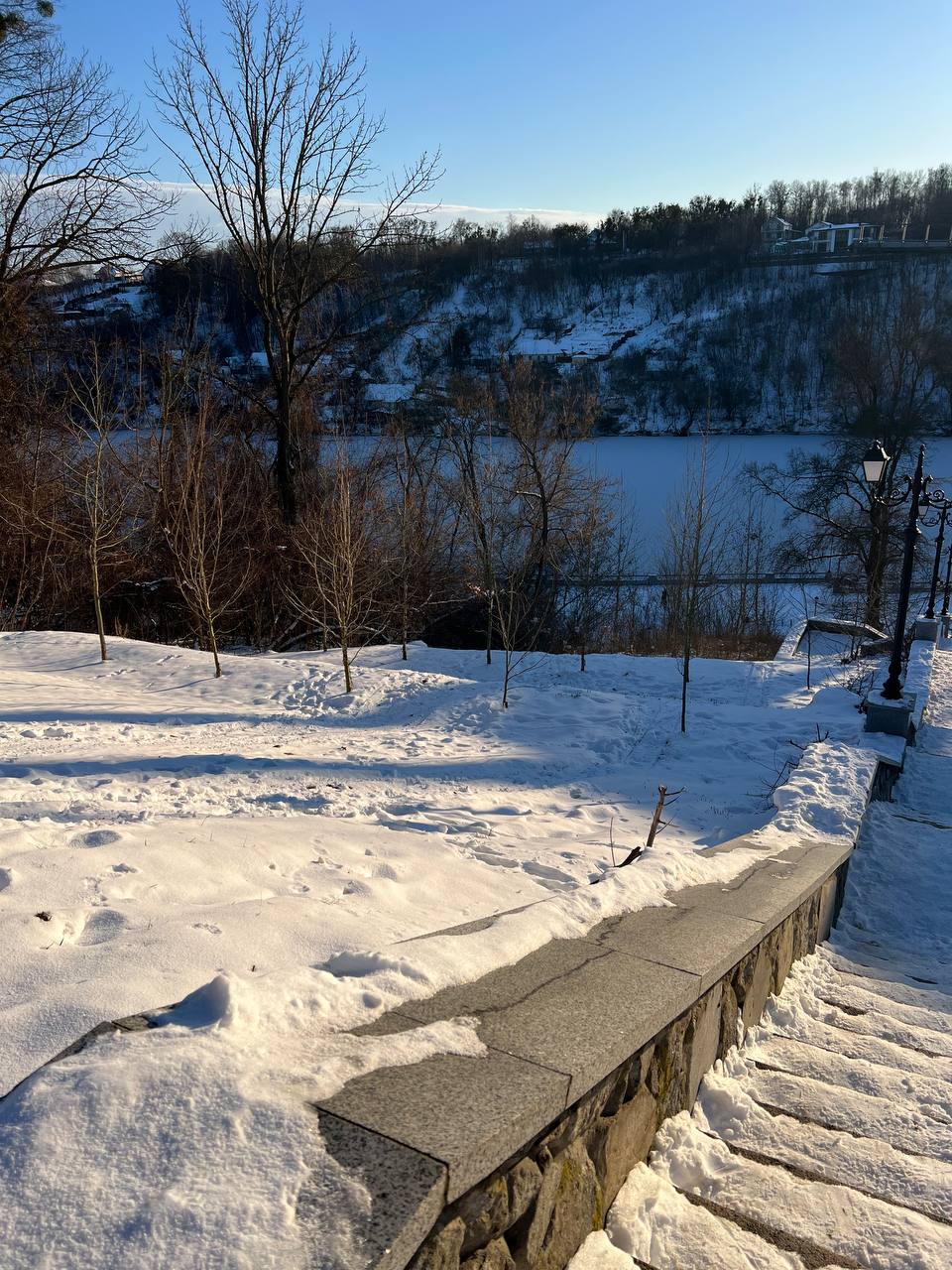А если захочешь спуститься к самой воде — есть два пути: широкая парадная лестница или крутой, почти экстремальный спуск. Там, внизу, можно посидеть с чашкой кофе и посмотреть на застывший Тетерев. А дальше тебя ждет знаменитая аллейка влюбленных — идеальное место для твоих зимних сториз.