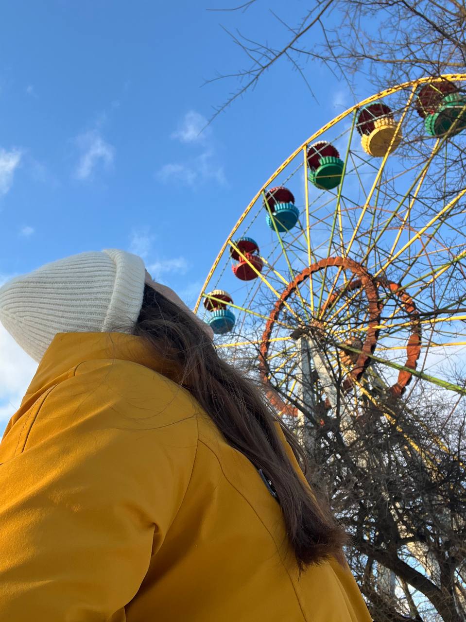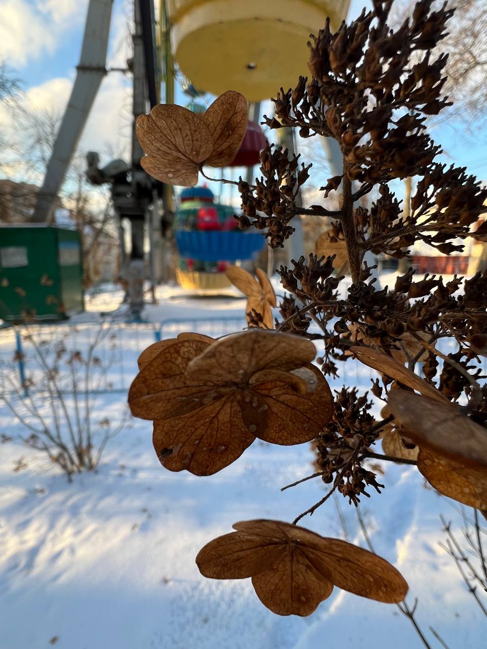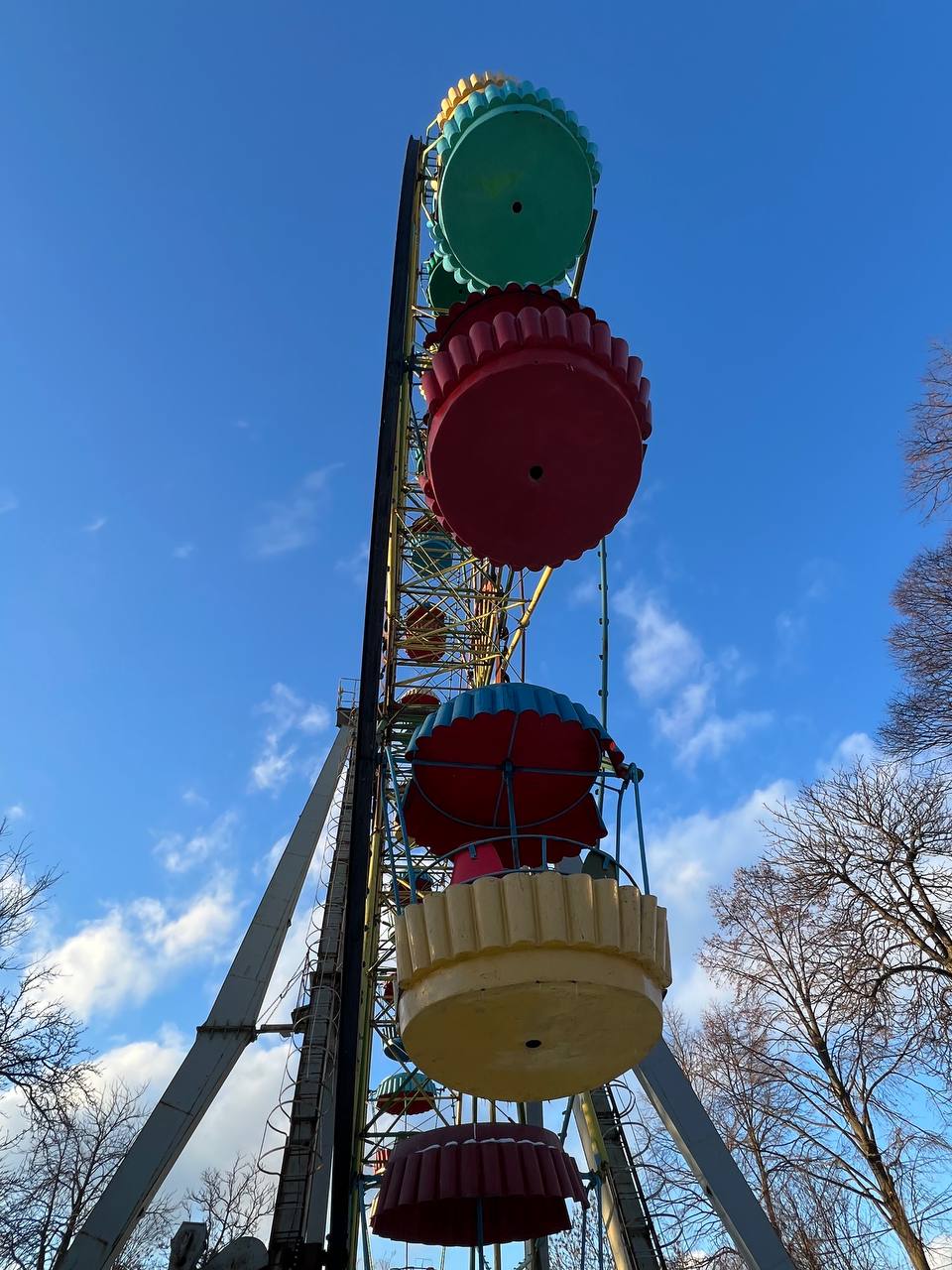 Если тебе мало дикой природы, загляни в зону аттракционов — зимой она превращается в настоящий портал в киношную эстетику. Главная звезда здесь — старое колесо обозрения.