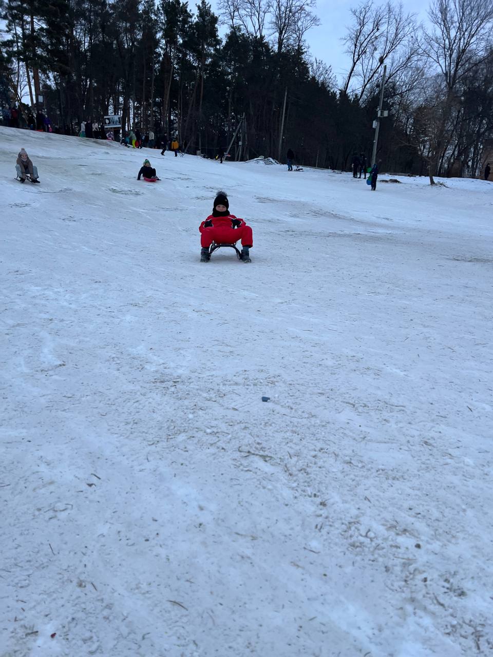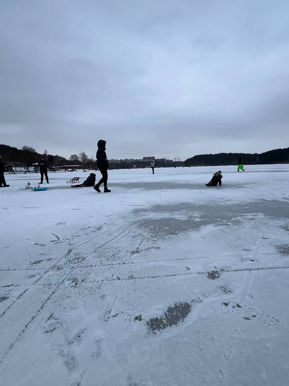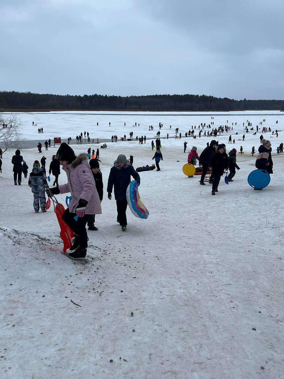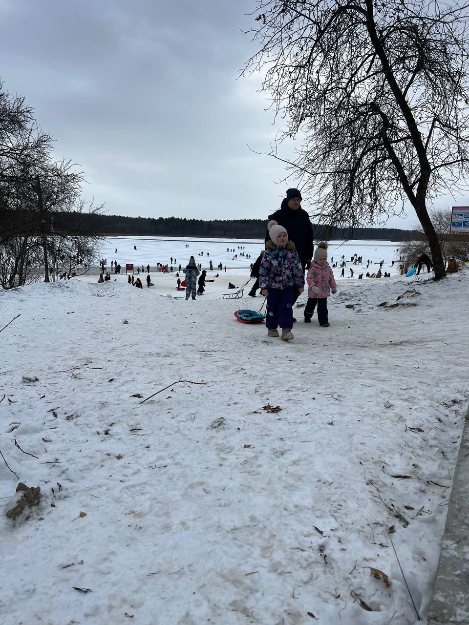 Пока взрослые устраивают променады по льду, дети вовсю гоняют на санках с горок.