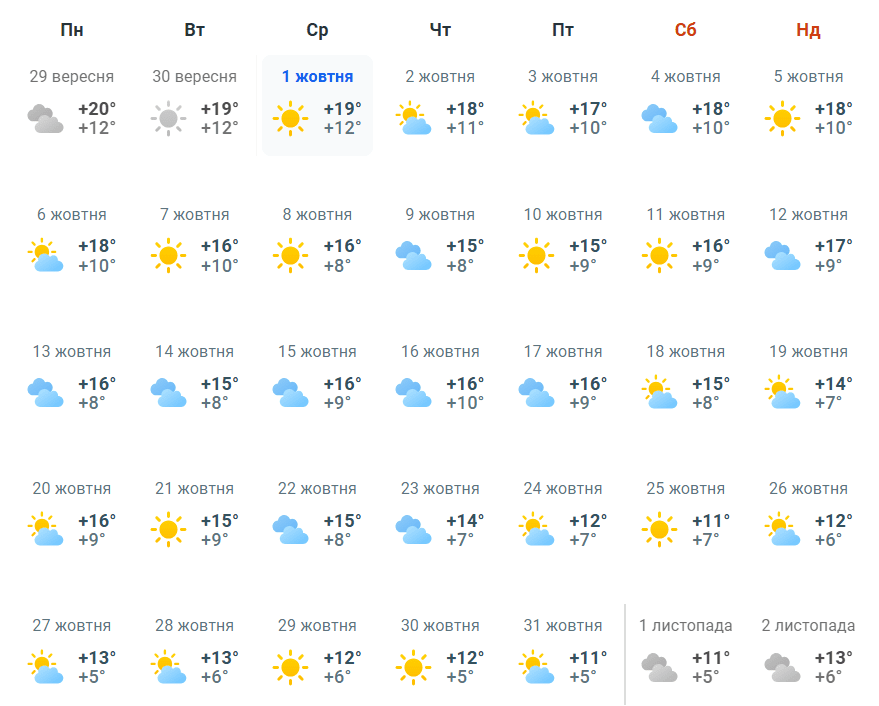 Прогноз погоды в Одессе в октябре: вторая декада, с 11.10 до 20.10.