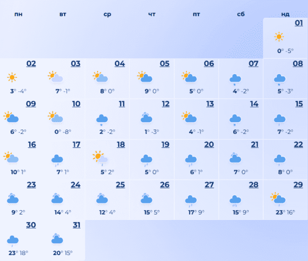 Месяц начнется холодно, особенно ночью: 1 марта ночные минусы достигают -5 °C, а днем столбик термометра едва поднимается до нуля.