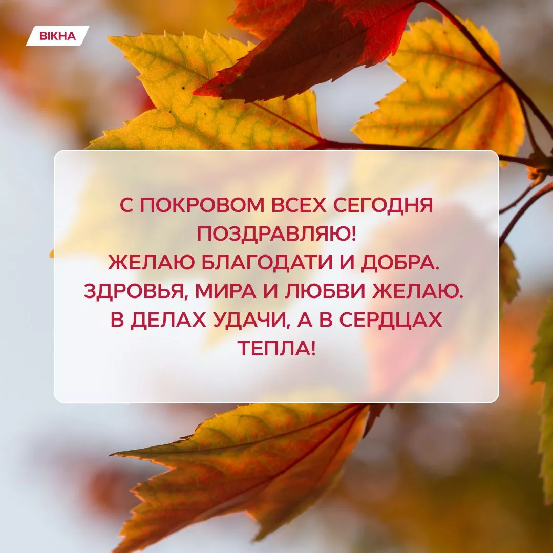 Поздравляю с днем Покрова Пресвятой Богородицы! Пускай все родные и близкие будут под надежной рукой Господа! Пусть все, кто тебе дорог, будут в безопасности и любви. Здоровья тебе, гармонии и мира!