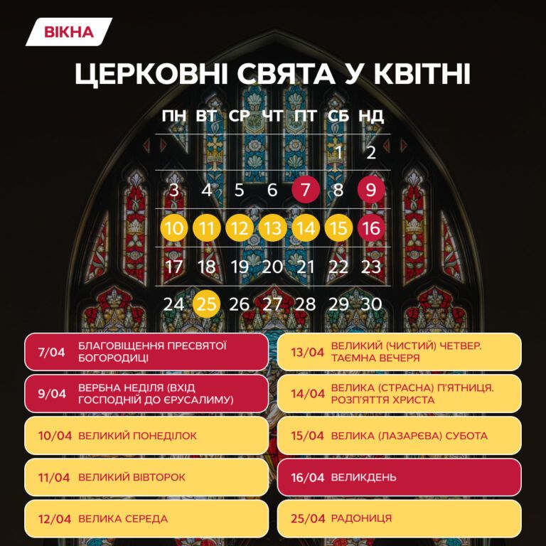 - 9 апреля — Вербное воскресенье (Вход Господень в Иерусалим). В этот день христиане отмечают вход Иисуса Христа в Иерусалим. Прочти больше о Вербном воскресенье в нашем материале.