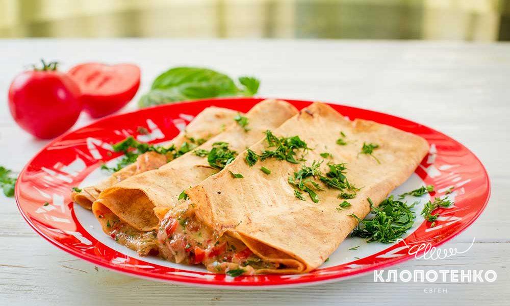 На второе приготовим запеченный лаваш с сыром вместе с перцем и помидором. Это блюдо — источник полезных веществ и энергии как минимум на 2-3 часа.