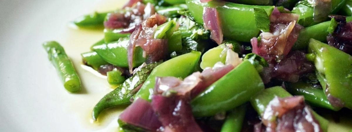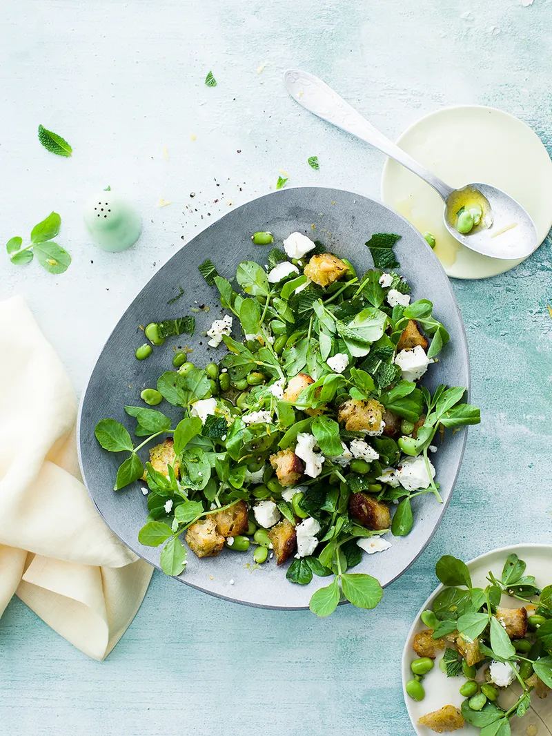 - С помощью шумовки переложи фасоль в миску для подачи. Сверху положи побеги гороха, листочки мяты, гренки и козий сыр. Можно добавить лимонный сок, цедру и немного полить маслом.
