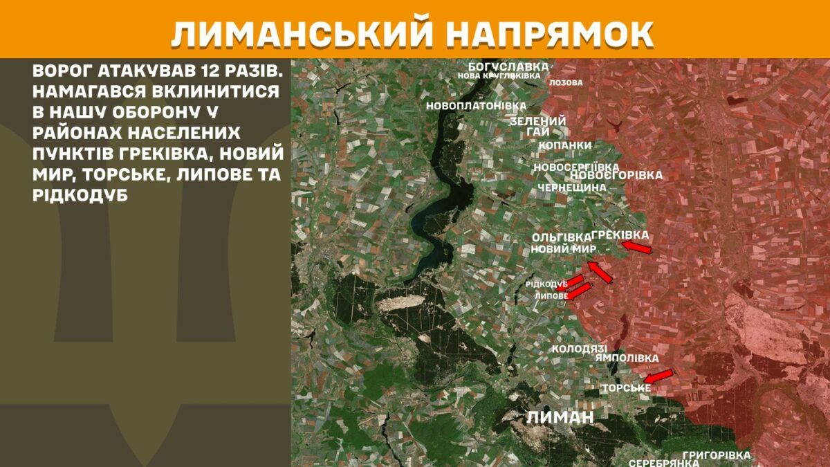 На Лиманском направлении враг атаковал 12 раз. Пытался вклиниться в нашу оборону в районах населенных пунктов Грековка, Новый Мир, Торское, Липовое и Редкодуб.