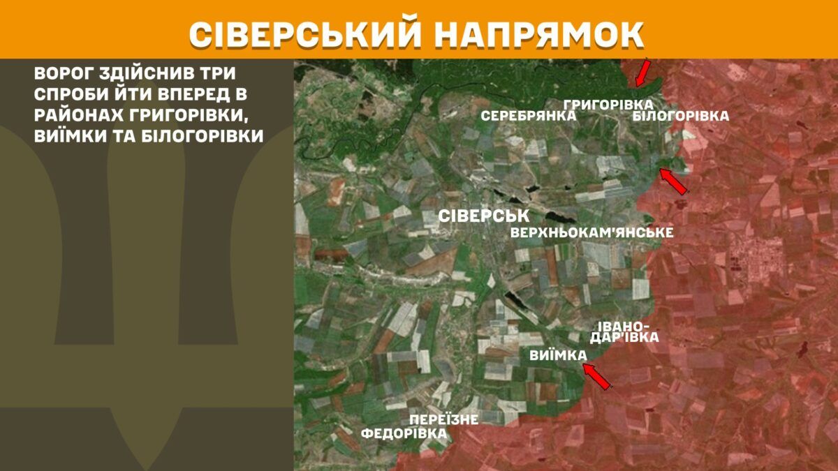 На Северском направлении враг предпринял три попытки идти вперед в районах Григоровки, Выемки и Белогоровки.