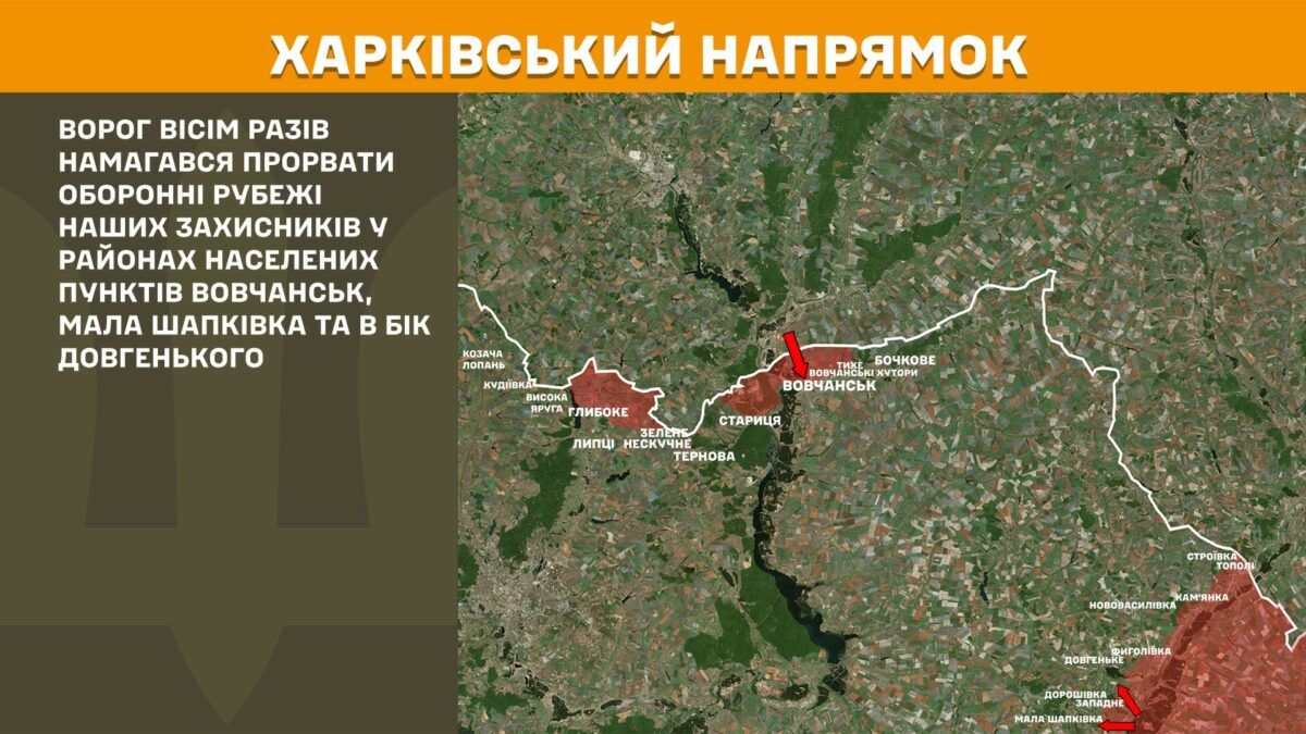 На Харьковском направлении враг восемь раз пытался прорвать оборонные рубежи наших защитников в районах населенных пунктов Волчанск, Малая Шапковка и в сторону Довгенького.