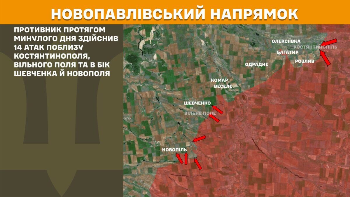 На Новопавловском направлении противник в течение прошедшего дня совершил 14 атак вблизи Константинополя, Вольного Поля и в сторону Шевченко и Новополя.