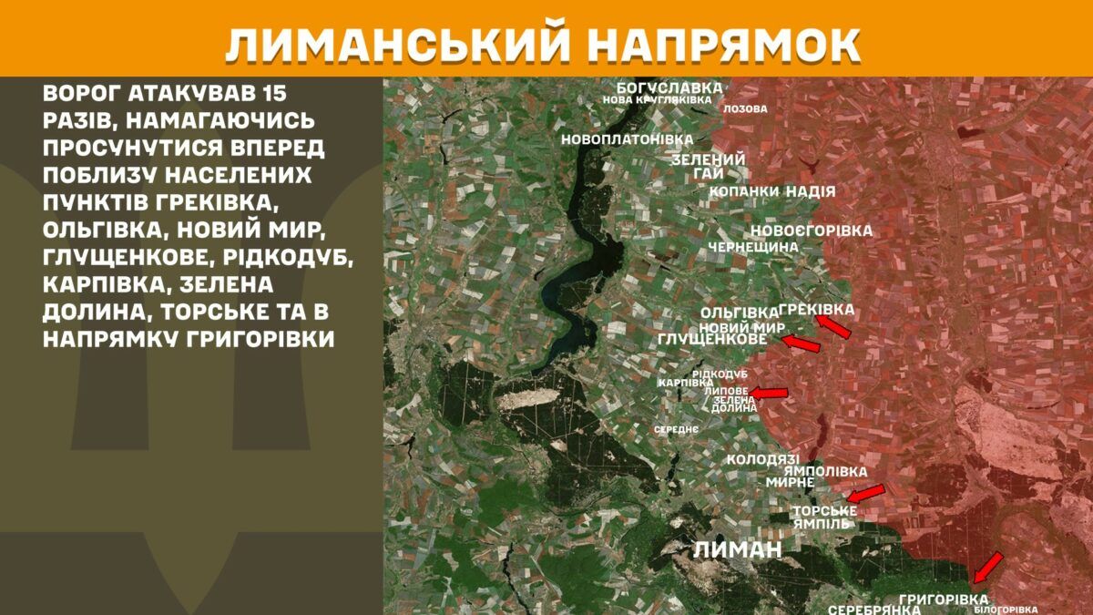 Враг атаковал 15 раз, пытаясь продвинуться вблизи Грековки, Ольговки, Нового Мира, Глущенково, Редкодуба, Карповки, Зелёной Долины, Торского и в направлении Григоровки.