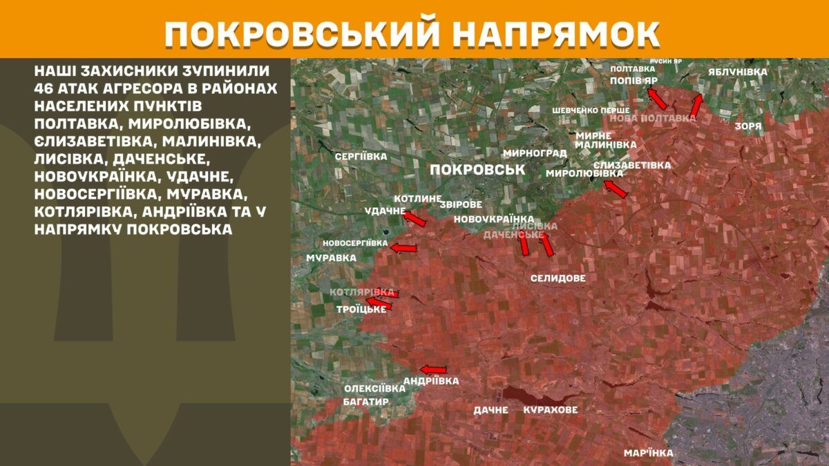 Защитники остановили 46 атак агрессора в районах Полтавки, Миролюбовки, Елизаветовки, Малиновки, Лысовки, Даченского, Новоукраинки, Удачного, Новосергеевки, Муравки, Котляровки, Андреевки и в направлении Покровска.