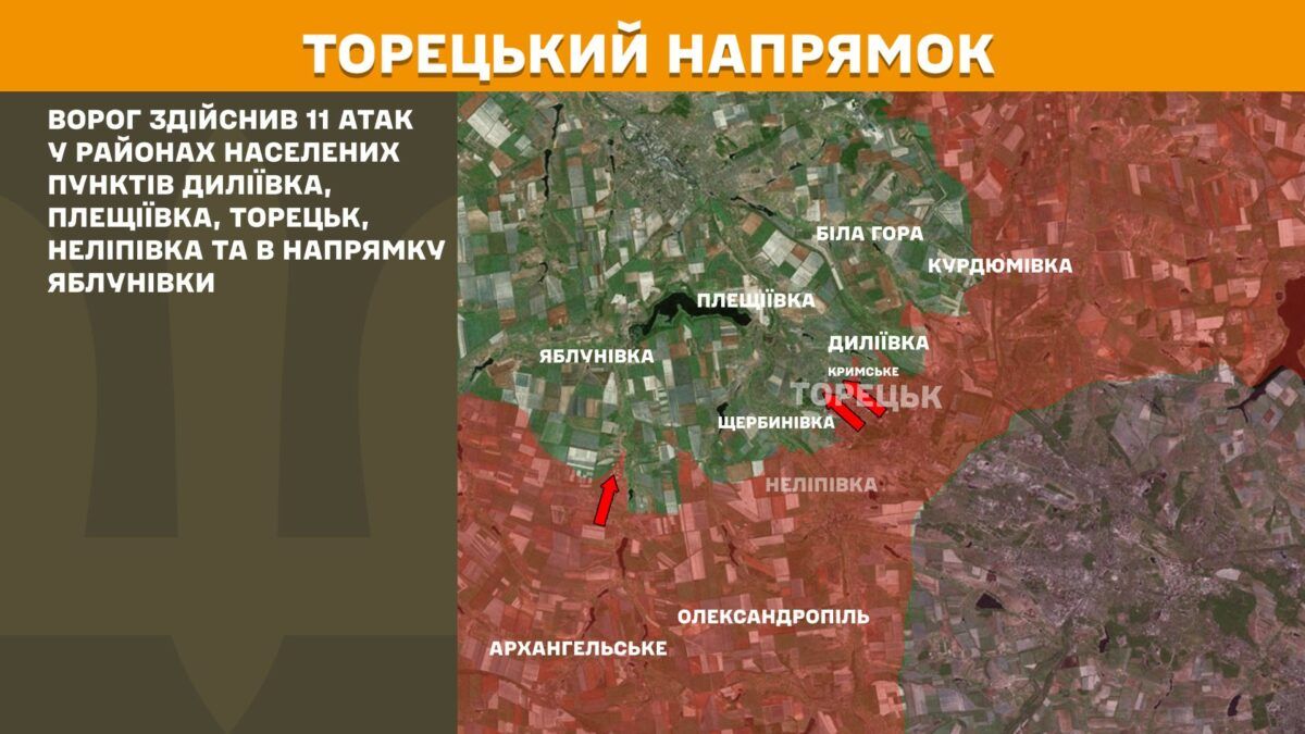 Враг совершил 11 атак в районах Дылеевки, Плещеевки, Торецка, Нелиповки и в направлении Яблоновки.