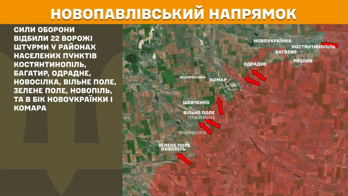 Силы обороны отбили 22 штурма в районах Константинополя, Богатыря, Отрадного, Новосёлки, Вольного Поля, Зелёного Поля, Новополя, а также в сторону Новоукраинки и Комара.