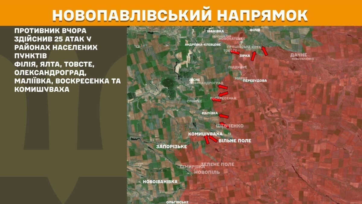 На Новопавловском направлении противник вчера совершил 25 атак в районах населенных пунктов Филиал, Ялта, Толстое, Александроград, Малиевка, Воскресенка и Камышеваха.