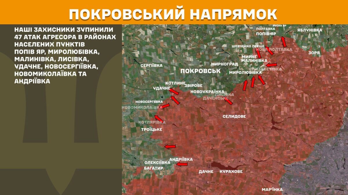 Підрозділи противника 47 разів намагалися прорвати оборону біля Попового Яру, Миролюбівки, Малинівки, Лисівки, Удачного, Новосергіївки, Новомиколаївки та Андріївки.
