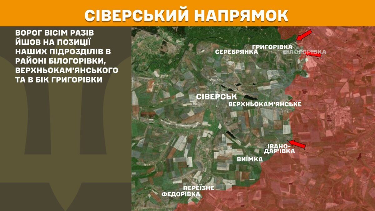Наші воїни відбили вісім ворожих атак у районах Білогорівки, Верхньокам’янського та в напрямку Григорівки.