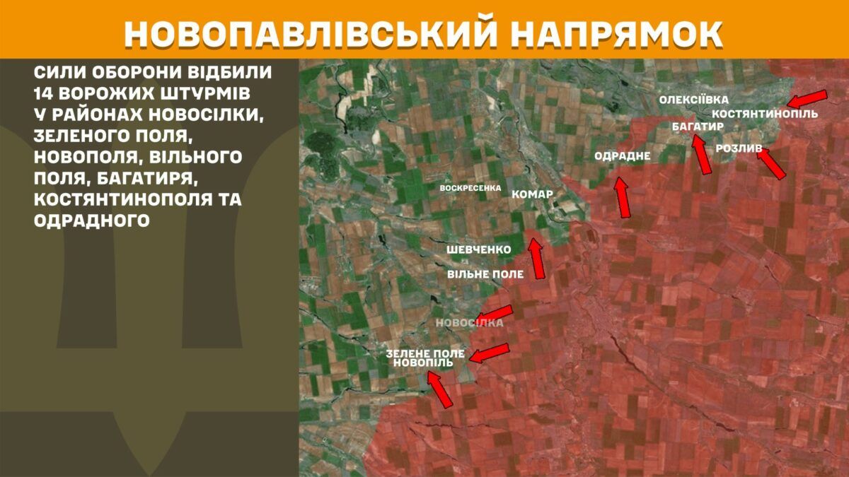 Силы обороны отразили 14 штурмов врага вблизи Новоселки, Зеленого Поля, Новополя, Свободного Поля, Богатыря, Константинополя и Отрадного.