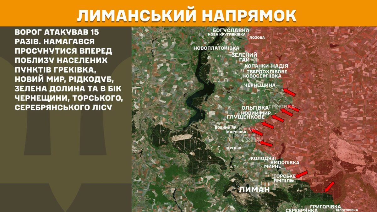На Лиманском направлении враг атаковал 15 раз. Пытался продвинуться вперед вблизи населенных пунктов Грековка, Новый Мир, Редкодуб, Зеленая Долина и в сторону Чернещины, Торского, Серебрянского леса.