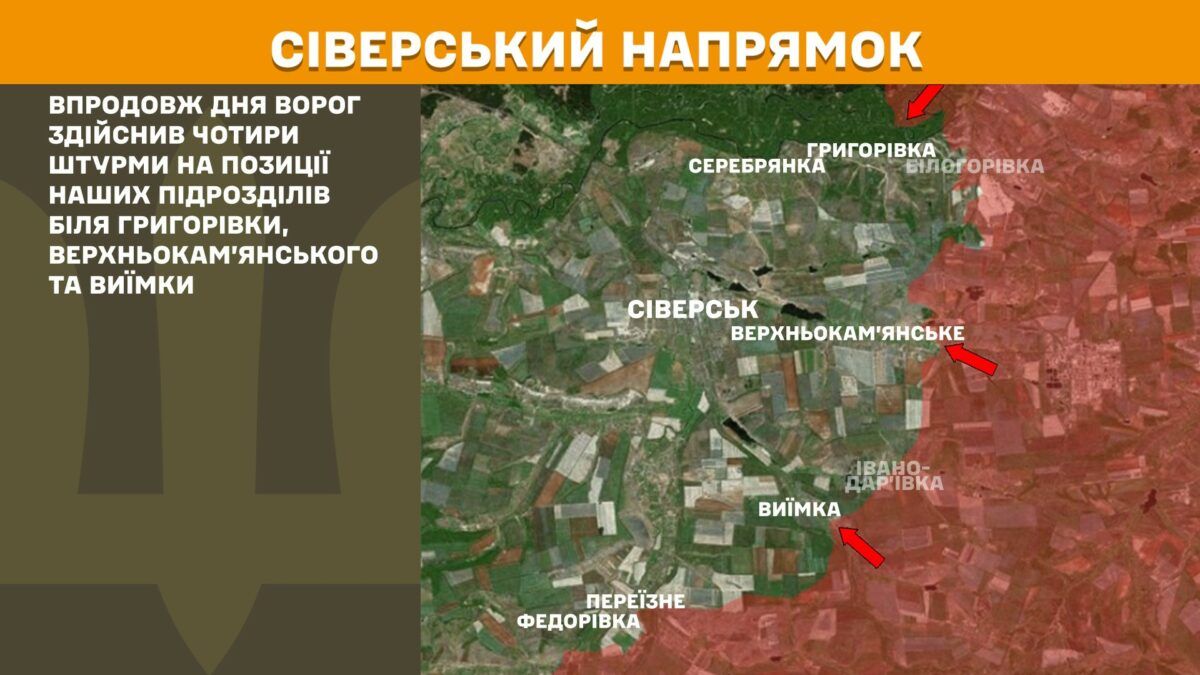 На Северском направлении в течение дня враг совершил четыре штурма на позиции наших подразделений возле Григоровки, Верхнекаменского и Выемки.