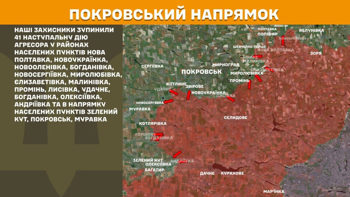 На Покровском направлении остановлено 41 наступательное действие агрессора в районах населенных пунктов Новая Полтавка, Новоукраинка, Новооленовка, Богдановка, Новосергеевка, Миролюбовка, Елизаветовка, Малиновка, Луч, Лисовка, Удачное, Богдановка, Алексеевка, Андреевка и в направлении Зеленого кута, Покровска и Муравки.