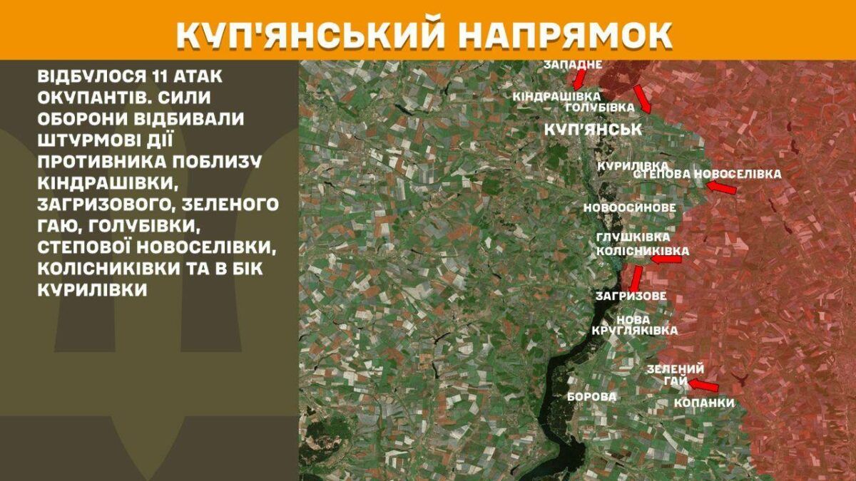 На Купянском направлении произошло 11 атак, отражены штурмовые действия вблизи Кондрашовки, Загрызового, Зеленого Роща, Голубовки, Степной Новоселовки, Колесниковки и в сторону Куриловки.
