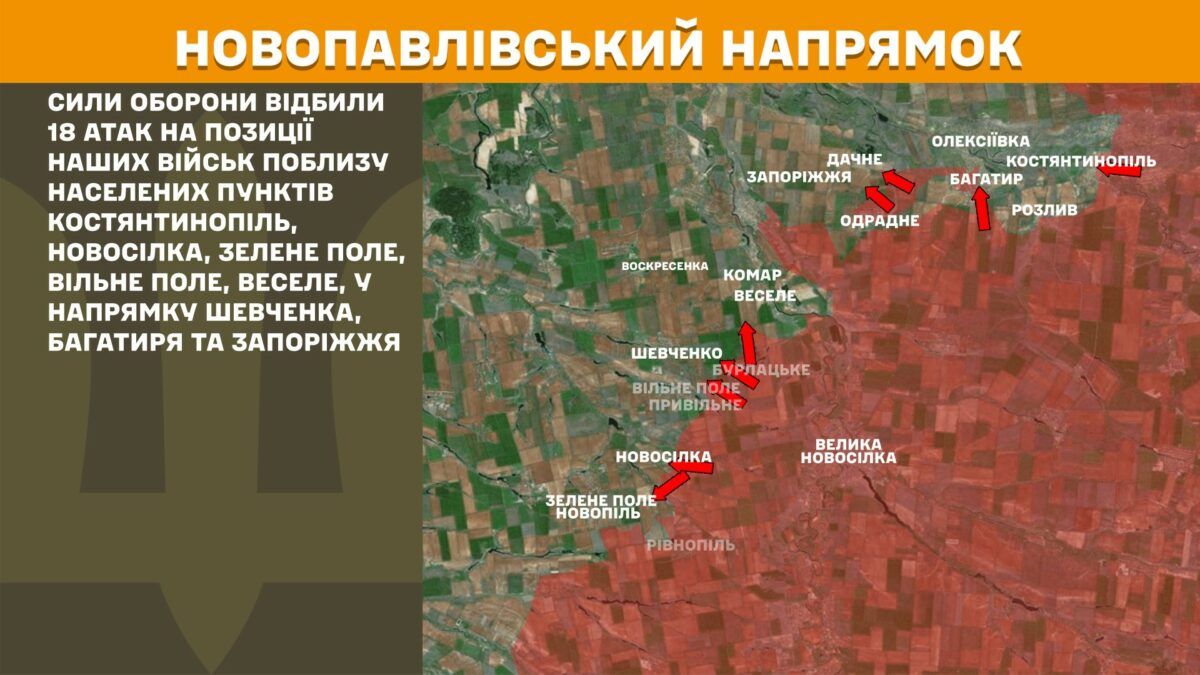 На Новопавловском направлении отражены 18 атак вблизи населенных пунктов Константинополь, Новоселка, Зеленое Поле, Свободное Поле, Веселое, в направлении Шевченко, Богатыря и Запорожья.