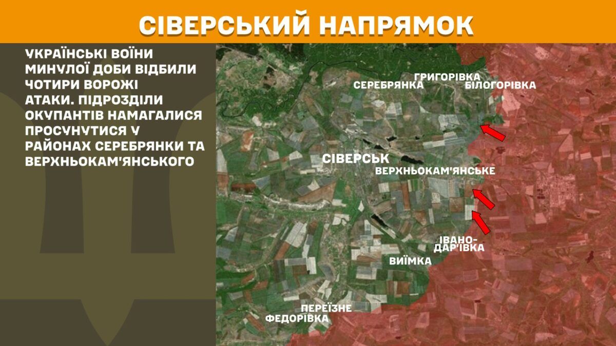 На Северском направлении украинские воины за прошлые сутки отбили четыре вражеских атаки. Подразделения оккупантов пытались продвинуться в районах Серебрянки и Верхнекаменского.