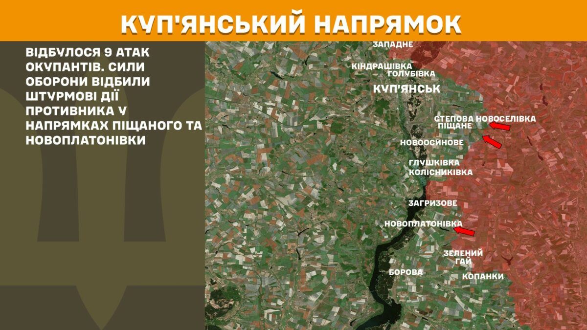 На Купянском направлении за прошедшие сутки произошло 9 атак оккупантов. Силы обороны отразили штурмовые действия противника в направлениях Песчаного и Новоплатоновки.
