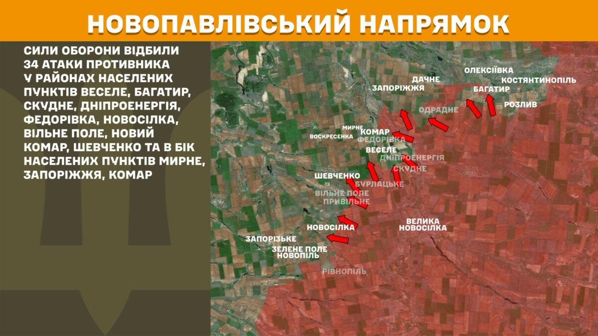 На Новопавловском направлении Силы обороны отразили 34 атаки противника в районах населенных пунктов Веселое, Богатырь, Скудное, Днепроэнергия, Федоровка, Новоселка, Свободное Поле, Новый Комар, Шевченко и в сторону населенных пунктов Мирное, Запорожье, Комар.