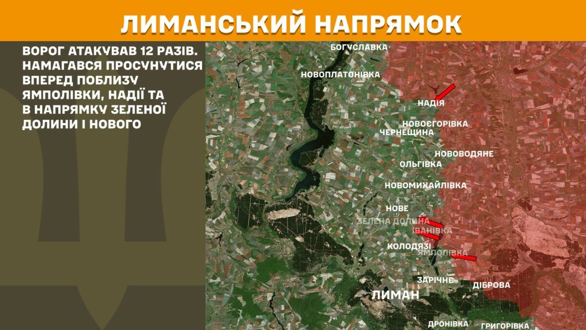 На Лиманском направлении враг атаковал 12 раз. Пытался продвинуться вперед вблизи Ямполовки, Надежды и в направлении Зеленой Долины и Нового.