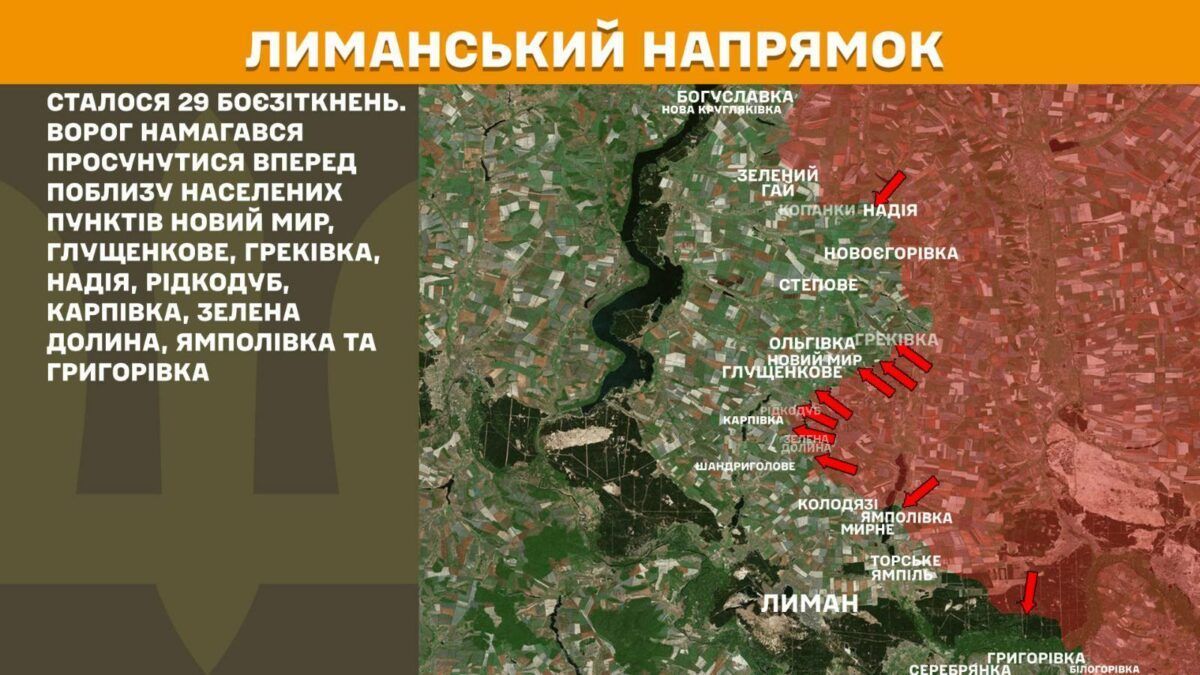 На Лиманском направлении произошло 29 боев. Враг пытался продвинуться вперед вблизи населенных пунктов Новый Мир, Глущенково, Грековка, Надежда, Редкодуб, Карповка, Зеленая Долина, Ямполевка и Григорьевка.