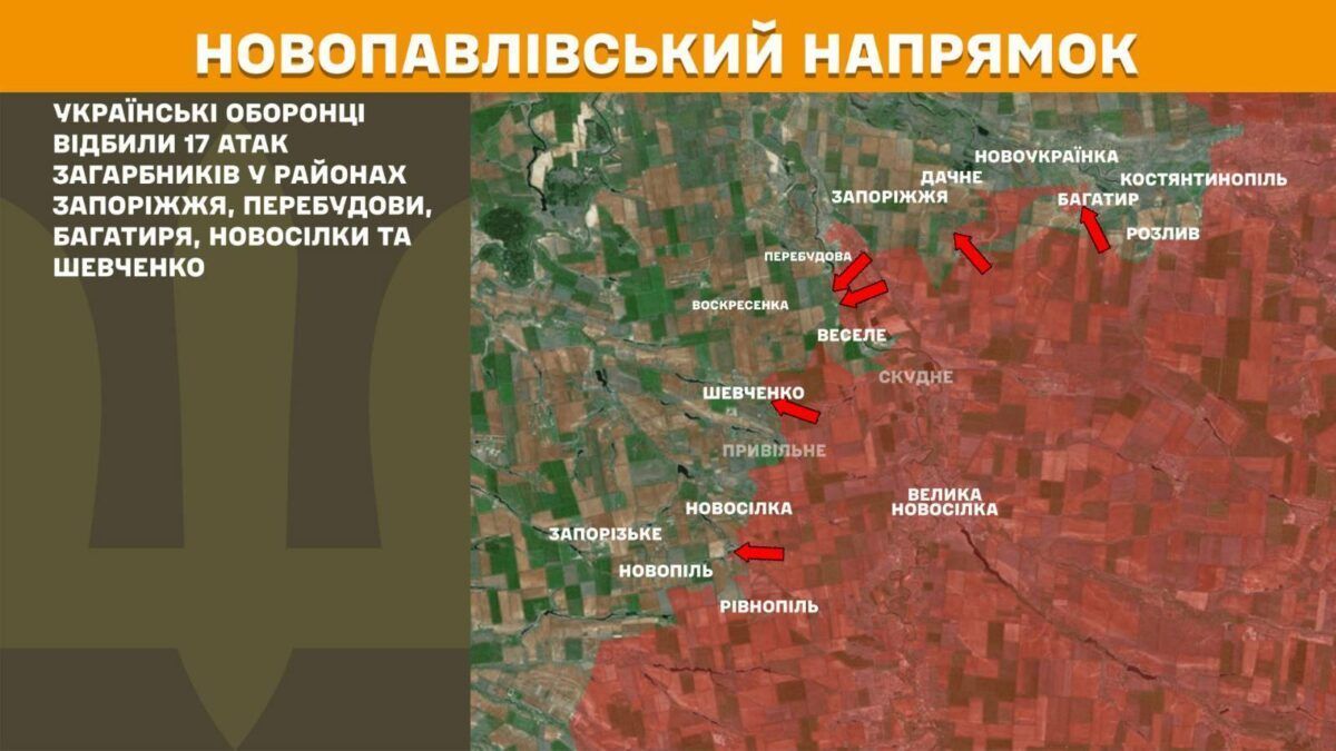 На Новопавловском направлении украинские защитники отразили 17 атак захватчиков в районах Запорожья, Перестройки, Богатыря, Новоселки и Шевченко.