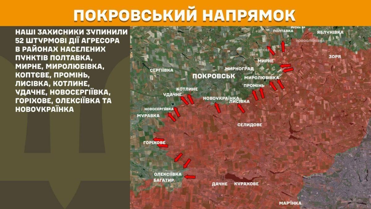 На Покровском направлении за прошедшие сутки наши защитники остановили 52 штурмовых действия агрессора в районах населенных пунктов Полтавка, Мирное, Миролюбовка, Коптево, Проминь, Лисовка, Котлино, Удачное, Новосергеевка, Орехово, Алексеевка и Новоукраинка.