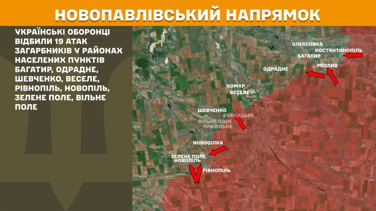 На Новопавловском направлении ВСУ отразили 19 атак захватчиков в районах населенных пунктов Богатырь, Одрадное, Шевченко, Веселое, Ровнополь, Новополь, Зеленое Поле, Свободное Поле.
