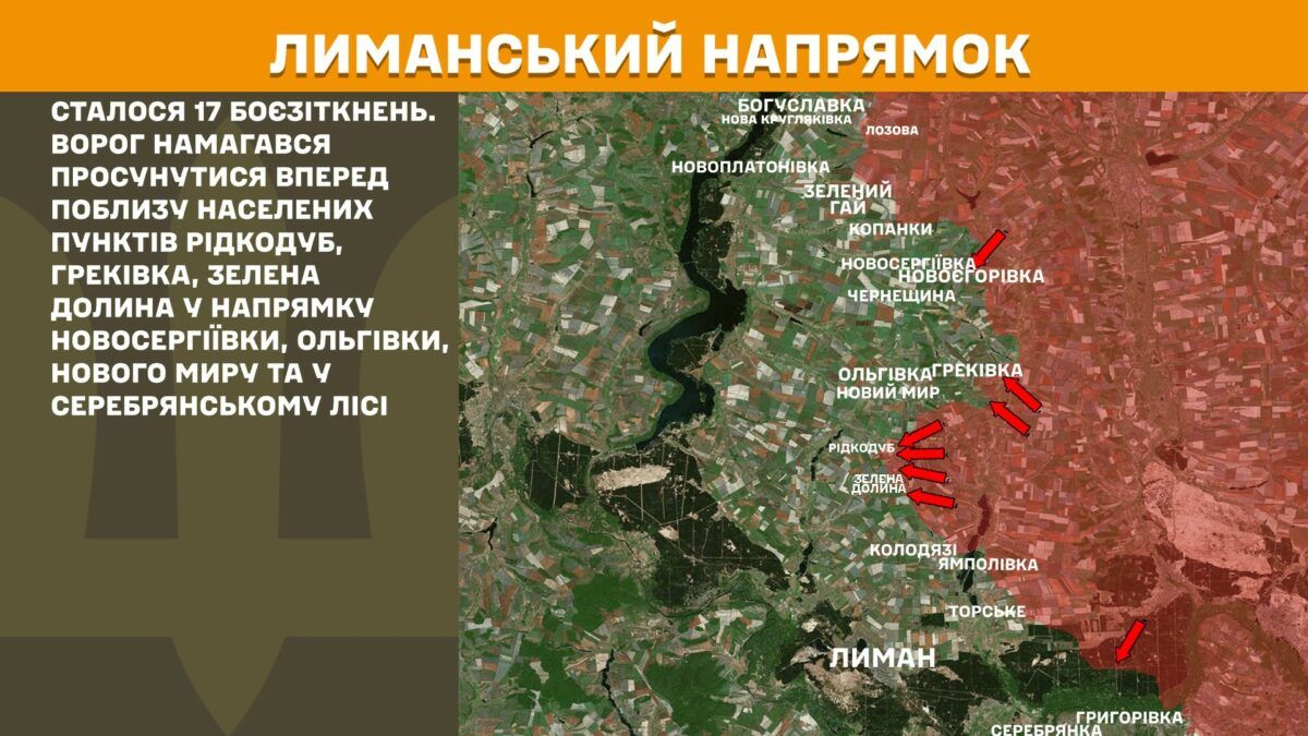 На Лиманском направлении россияне провели 17 боевых столкновений, пытаясь продвинуться вблизи населенных пунктов Редкодуб, Грековка, Зеленая Долина в направлении Новосергеевки, Ольговки, Нового Мира и в Серебрянском лесу.
